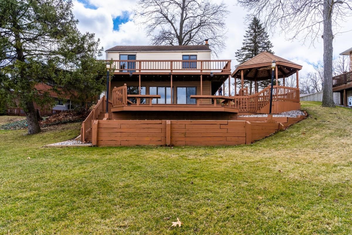 Excellent location on Jimmerson Lk with 130 Ft of lakefront and nice views! Multi level and partially covered deck with a gazebo make outdoor entertaining a breeze. The lower level was completely updated in 2018 and features an open concept living room, dining area and kitchen with luxury vinyl plank flooring. The lower level walks out to the deck and private side patio. The island kitchen has a breakfast bar and all the appliances are included. There is a pantry storage closet and full bathroom. Upstairs on the main level you will find 3 bedrooms and a full bathroom with laundry facilities. The washer and dryer are included. Hardwood floors in the entry, hall and three bedrooms. Tile in the upstairs bathroom. New furnace in 2018. The pier can stay in the water all year. Includes a lakeside 10x16 storage shed, pier, and 26x40 detached garage. Within walking distance to several restaurants, pubs, The Corner Landing and Tom's Donuts. There is a sandy beach area. Seller uses an Aqua Thruster.