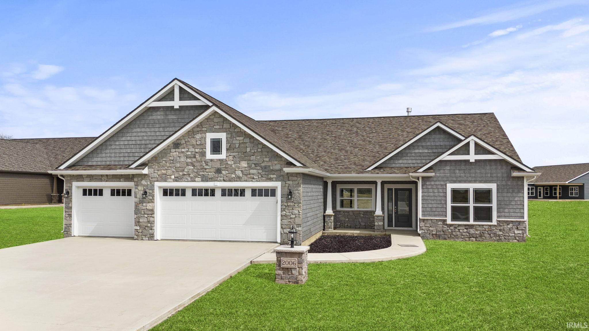 New Villa Built by Kiracofe, The Ashley III Floor plan with 2050 sq.ft. is a 3 bedroom plus Den/bedroom, 2 1/2 bath ranch style home in Bridgewater Golf Community Villas. This home offers a large Great Room with cathedral ceilings, with gas log fireplace. Kitchen with flush bar top, QUARTZ counter tops, upgraded cabinets,huge pantry, stainless steel appliance package. Large laundry room with laundry tub and folding area next to mud room off 3 car garage with lockers and access to 1/2 bath. Master bedroom with tray ceiling, large walk in closet, tile walk in shower, and two vanities. Two additional bedrooms and full Jack and Jill bathroom. 4th bdrm, Den or office in front. Large covered porch in front. In back is a 26x11'6" Covered Patio, and a 26x10' open patio for enjoying friends and family or just quiet relaxation. 3 car garage with service door. Front landscaping and whole yard irrigation included. Whole yard seed and straw. Community Pool/tennis/pickle-ball.