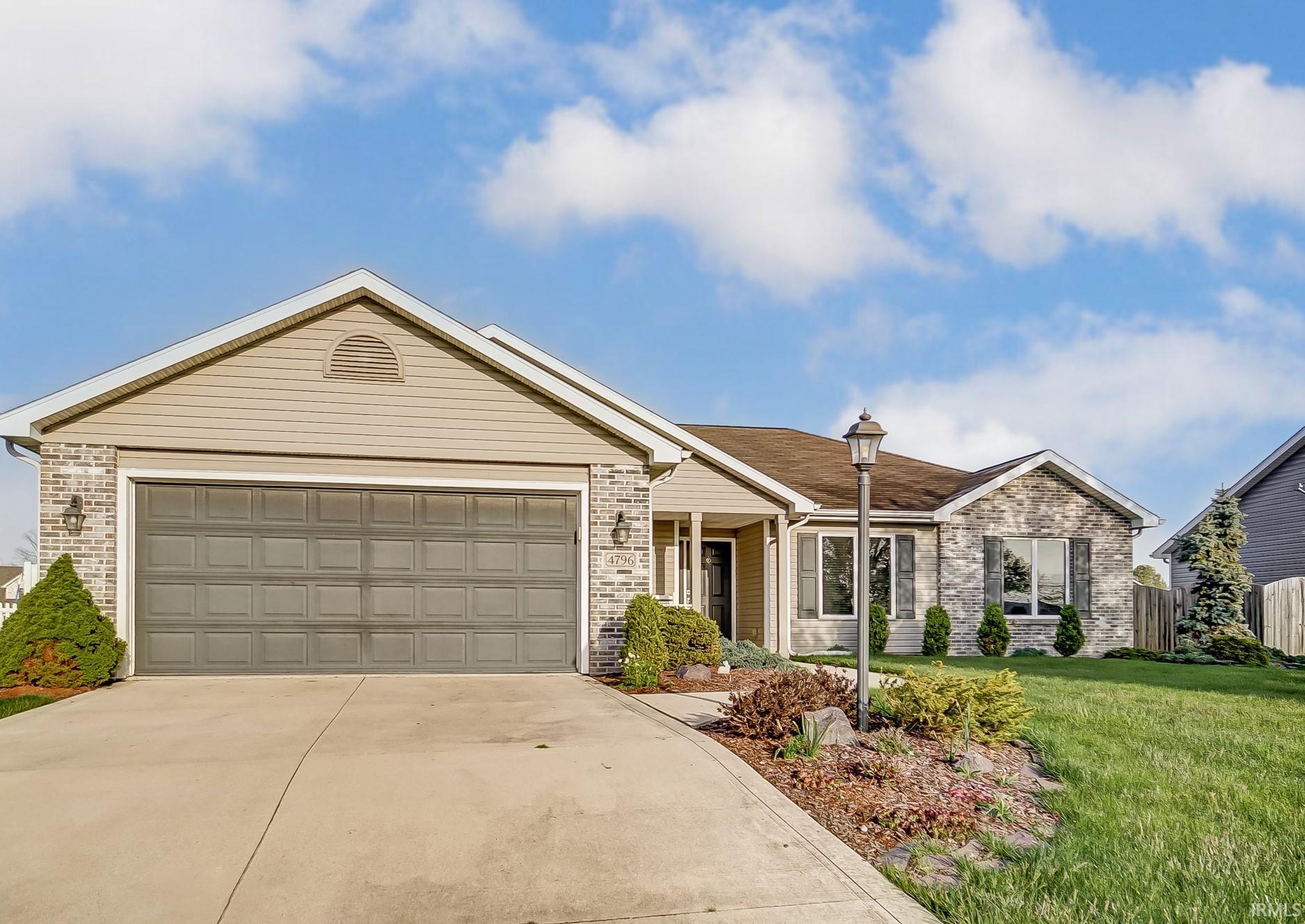 Welcome to this stunning Ranch-style home in the desirable Pinestone community. As you step inside, you're greeted by a spacious great room boasting a soaring double cathedral ceiling, a cozy corner fireplace and natural light streaming through a charming half-circle window. The kitchen showcases Grabill cabinets, complete with dovetailed drawers, offering both quality and functionality. The master bedroom features a raised ceiling and an ensuite bath, complete with a corner garden tub, a double sink vanity, a separate shower, and a generously-sized walk-in closet. Step outside to discover the backyard oasis, enclosed by a 6-foot vinyl fence, complete with a beautiful covered patio/pavilion, perfect for summer fun and entertaining guests. This home boasts newer LVP flooring throughout most of the living space. Other features included: Nest thermostat and doorbell, Anderson windows, finished garage with ample storage space above. All appliances, including the washer and dryer, are included for your convenience but not warranted.